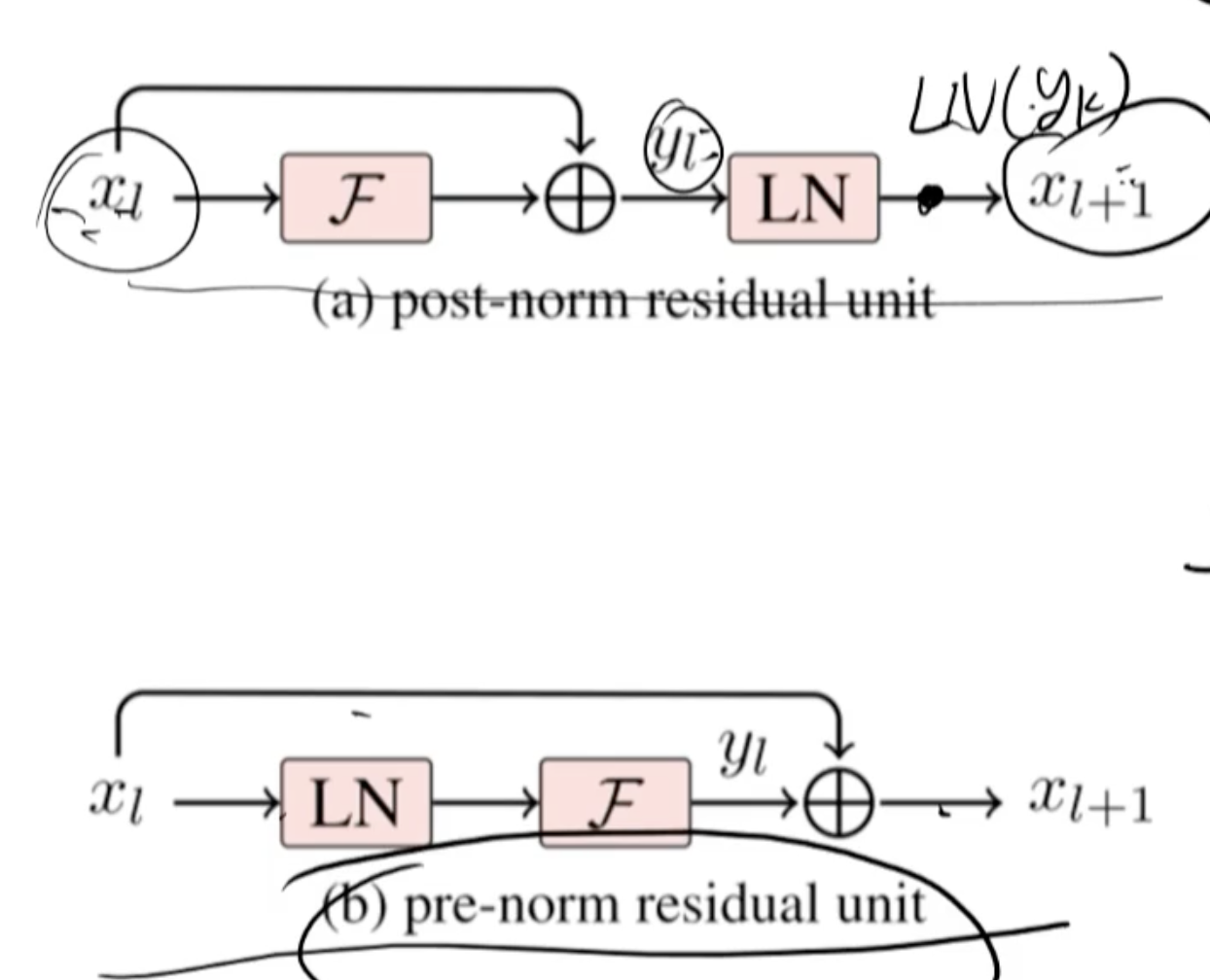 其中,( y_l = x_l + \mathcal{F}(x_l) ),并且(\tilde{x}_{l+1} = \text{LN}(y_l))。